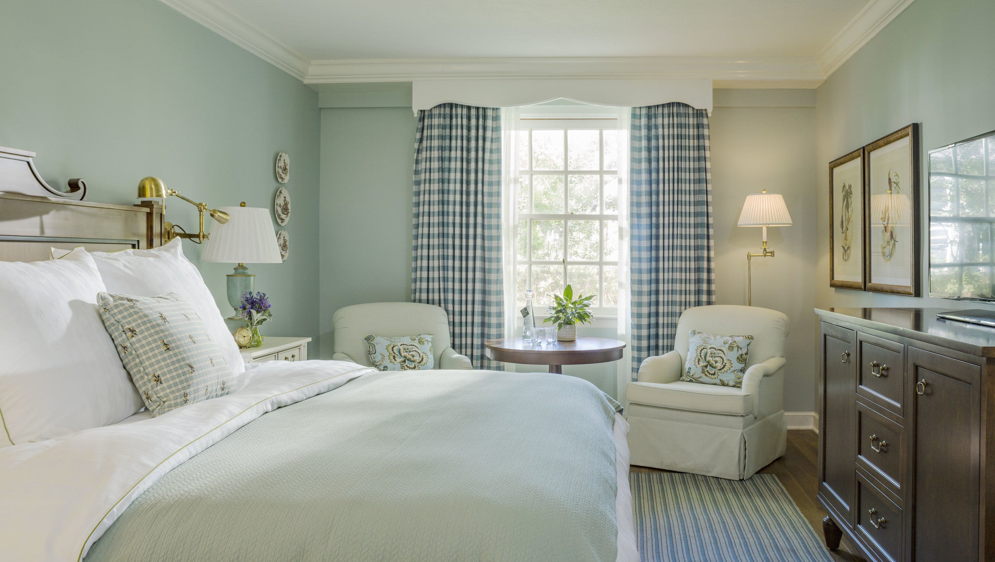 Garden Rooms feature king beds with pillow-top mattresses, hardwood floors, custom window treatments, vintage brass reading lamps, and a garden view.