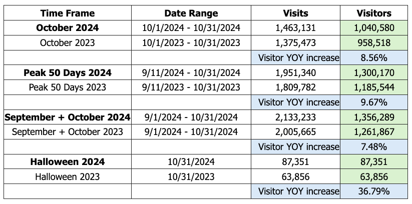Salem saw 1,040,600 visitors in October for its annual month-long Haunted Happenings festival, an 8.6 percent increase over last October, according to the city. And on Oct. 31, 87,351 people visited Salem, compared to 63,856 in 2023 — a 37 percent increase.