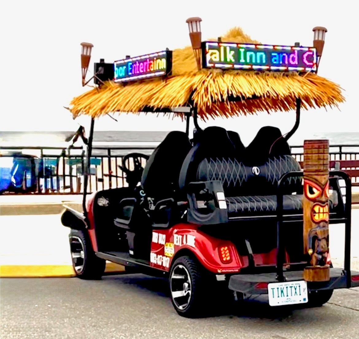 Tiki Taxi, owned by Brian Sonia, made its debut on Ocean Boulevard on May 15. The six-person, five-passenger tricked-out golf cart with a thatched roof runs daily from Hampton Beach State Park to North Beach.
