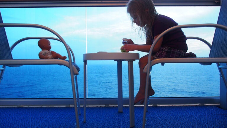 After our fun-filled shore adventures, we spent our final two days at sea relaxing by the pool and getting bamboo massages. Some of our most memorable moments were simple ones: watching Grace have a tea party with her baby doll on our balcony, trying to eat ice cream in the tropical heat before it melted onto our flip-flops, discovering tucked-away lounges and sunning areas around the ship, and chatting with fellow passengers.
