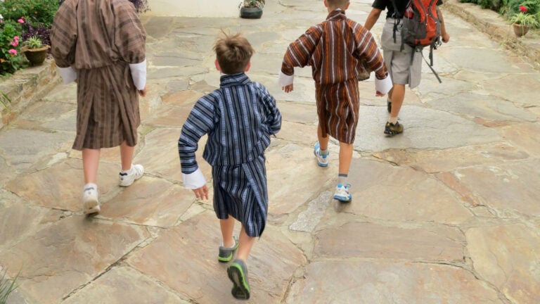 Our trip was punctuated with moments that seemed carved out of a National Geographic special. Shortly after arrival, for instance, our guide TP whisked the boys into a local fabric store. They walked in wearing shorts and T-shirts and emerged sheathed in ghos, the sashed knee-length robes that are the national dress of Bhutan. Outfitted accordingly, the boys attended school, once at a village primary and another time at a Save the Children-funded elementary in a remote part of the country.