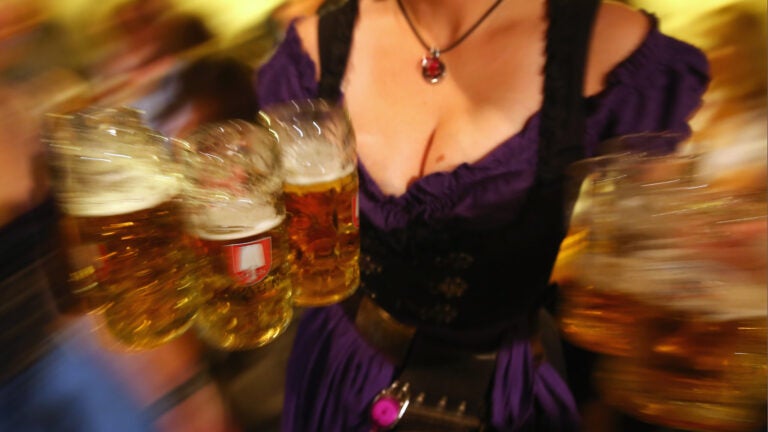 A waitress delivered glasses of beer in the cellar of the Munich Beer and Oktoberfest Museum.