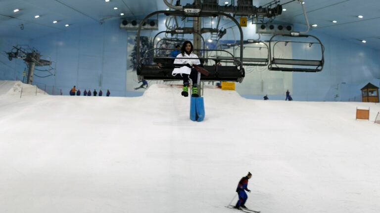 Visitors ski and ride in chairlifts in Dubai’s indoor mountain-themed ski park, at Emirates mall in Dubai. The theme park features five runs, including a 400-metre ski slope that holds more than 6,000 tons of snow.