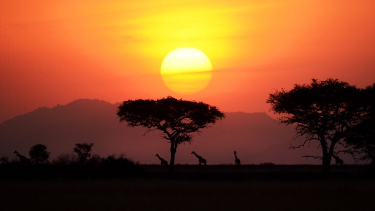 Red and orange hues of the dusk hours painted the African savannah as a herd of giraffes retired for the night along the outskirts of Serengeti National Park in Tanzania.