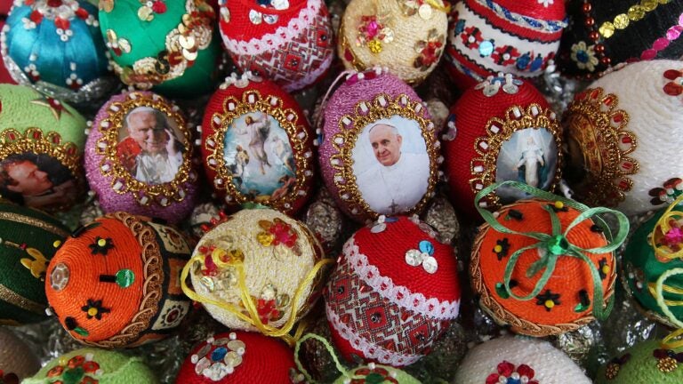 Embroidered eggs are some of the many nonedible eggs for sale for Easter at Robin’s Candy on Newbury Street in Boston.