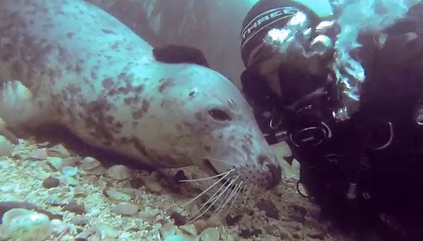 A seal poses for a photo in the Farne Islands off the coast of England. He is frolicking with scuba diver Jason Neilus in the “GoPro: Seal Belly Rub’’ ad.