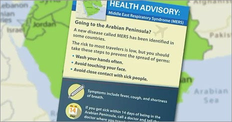 The health advisory asks people who travel to the Arabian Peninsula (including Bahrain, Iran, Iraq, Israel, Jordan, Kuwait, Lebanon, Palestinian territories, Oman, Saudi Arabia, Syria, the United Arab Emirates, and Yemen) to wash their hands often, avoid touching their face, and avoid close contact with sick people. The materials also educate travelers about the stymptoms of MERS, which include fever, cough, and shortness of breath.
