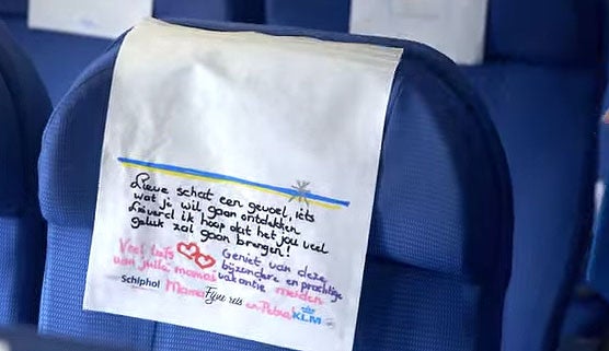 After bidding your loved one goodbye at the security line, unbeknownst to you, a KLM employee whisks him or her off to write a message to you. Once that heartfelt message, maybe even accompanied by a colorful little drawing, is complete, another KLM employee rushes that message onto your plane, finds your seat number, and sticks it to your headrest cover. When you board your flight and find your seat, voila!