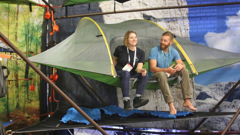 Ricardo Bottome, of Treepod, is shown at the Treepod display during the Outdoor Retailer show Thursday in Salt Lake City.