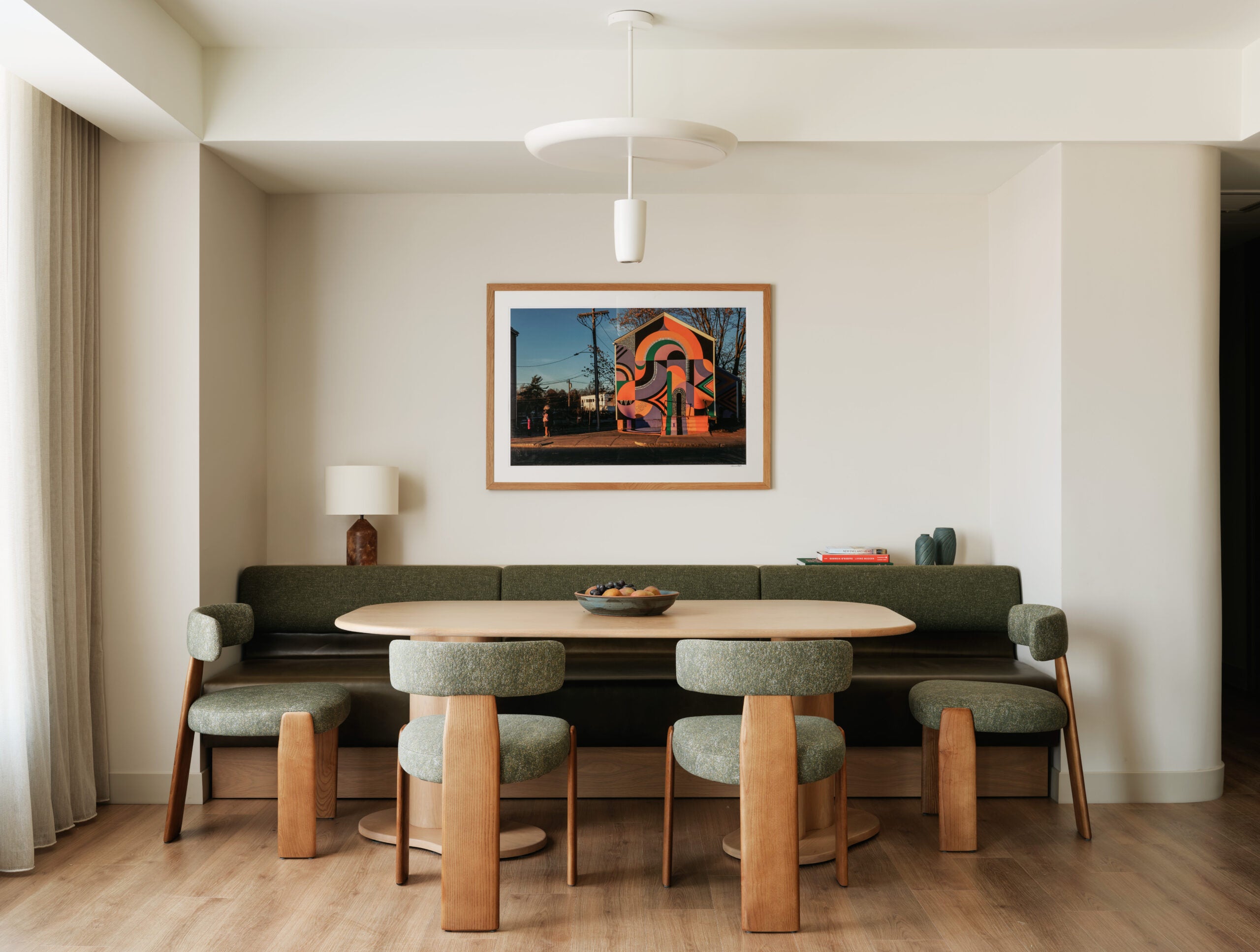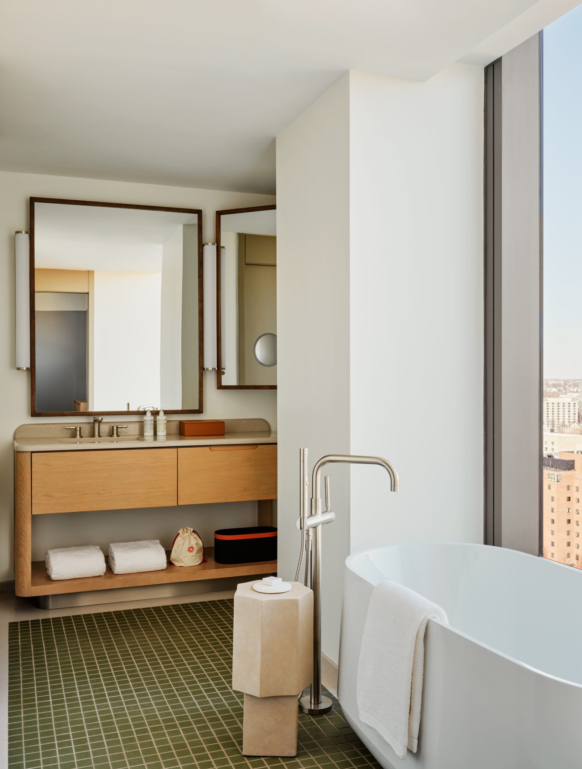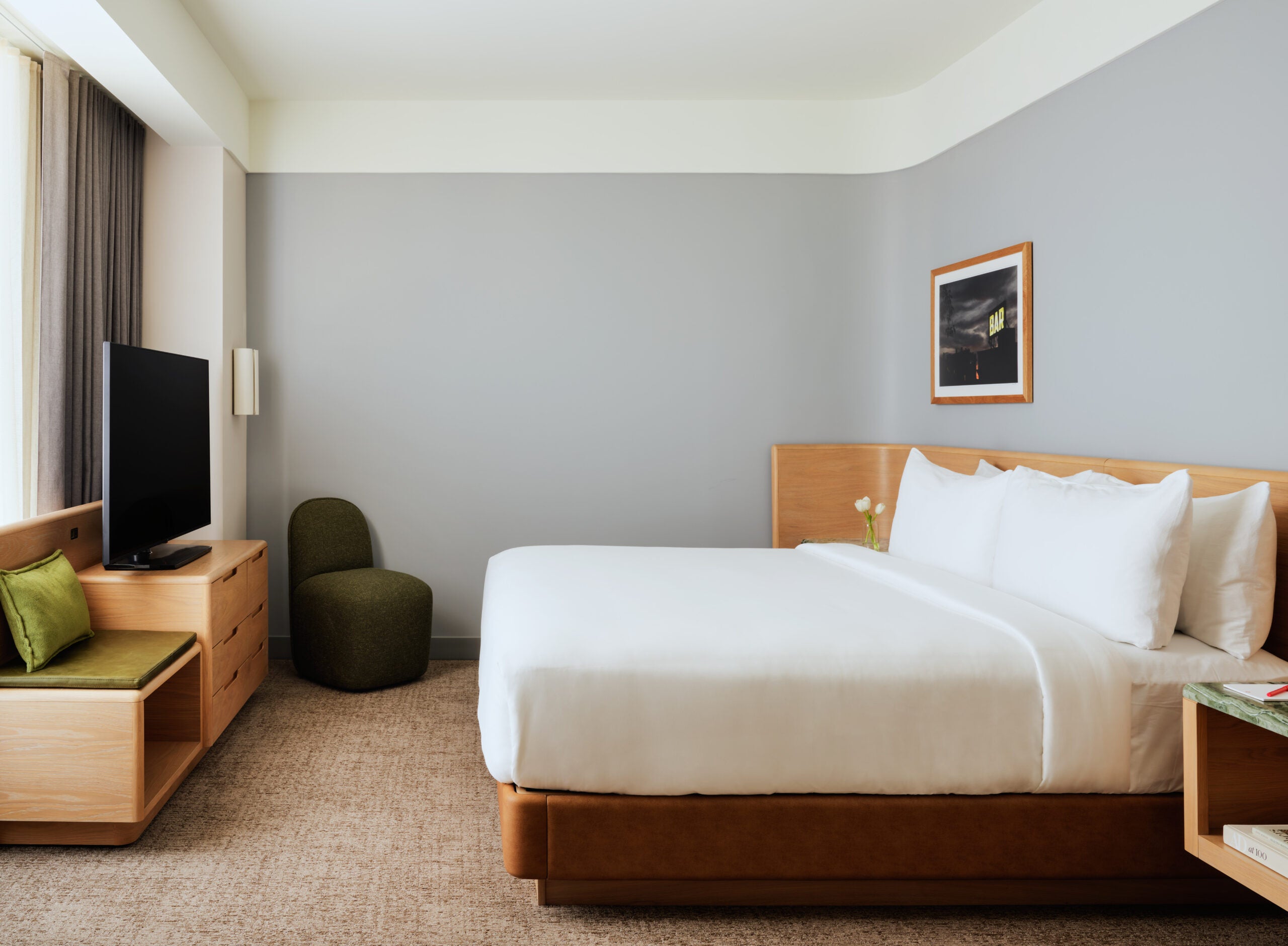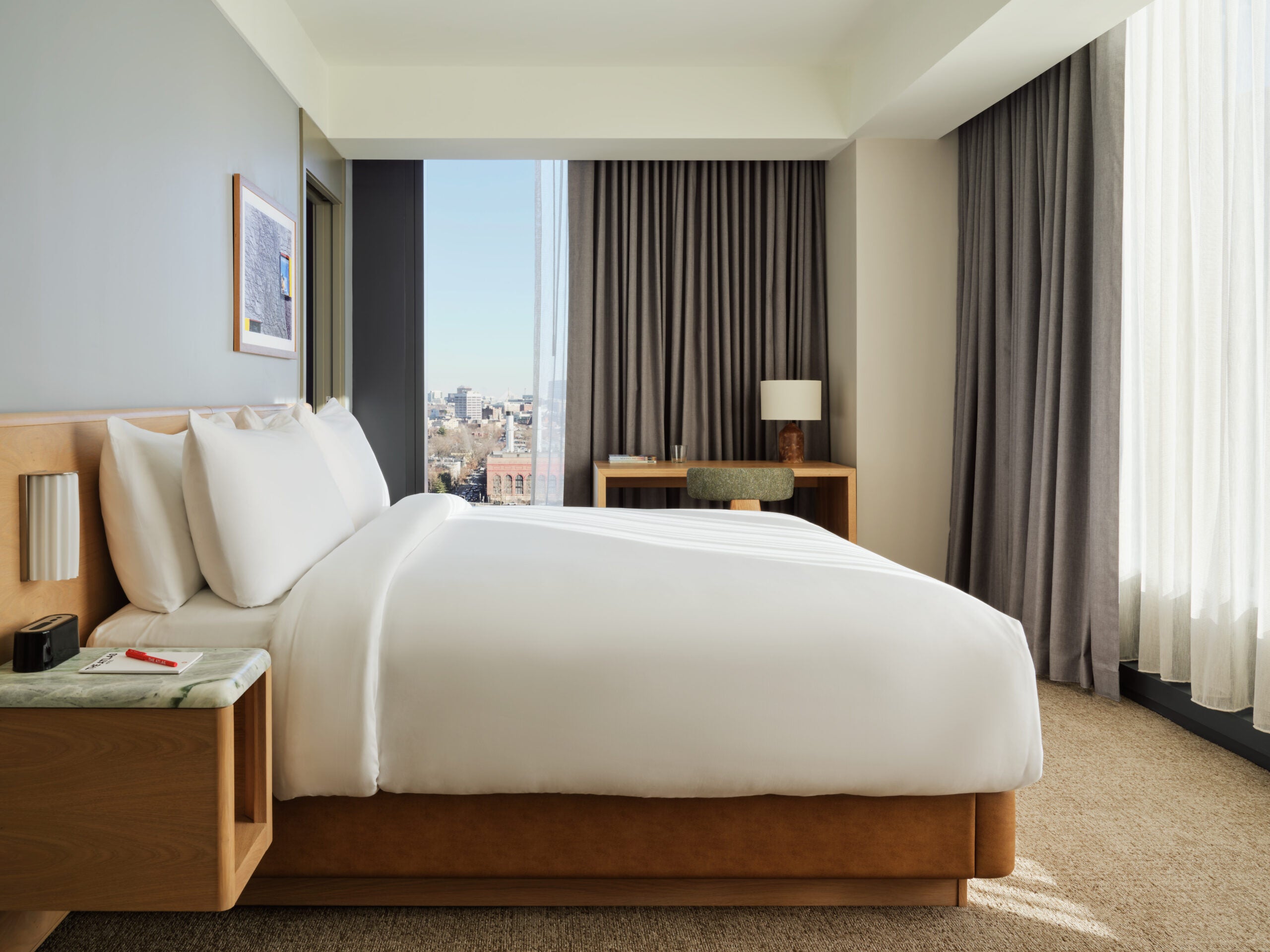 The work of Boston photographer Edward Boches is featured inside the guest rooms, which have floor-to-ceiling windows. The rooms are done in grey and earthy tans and include layered lighting and tailored millwork, bullnose marble accent tables, and mossy green textiles inspired by the Allston greenway outside.