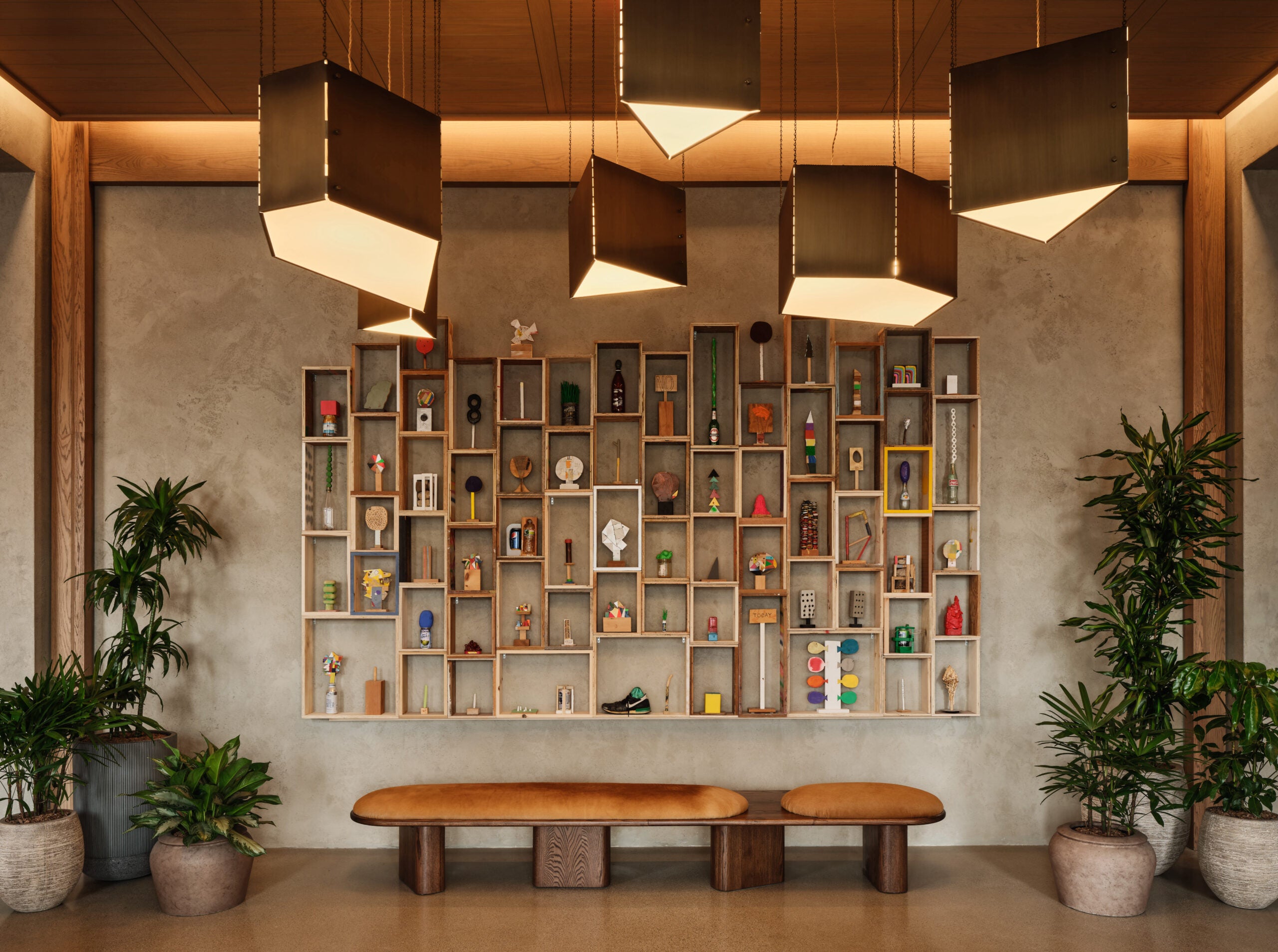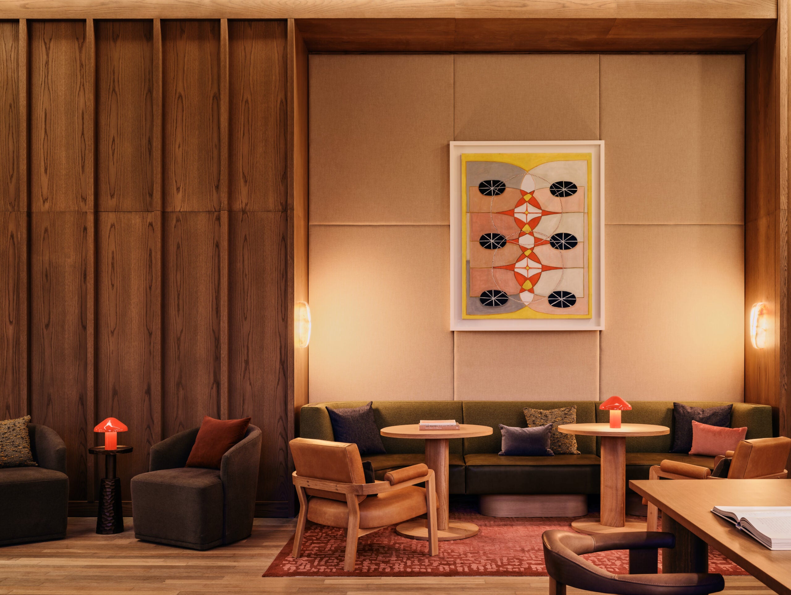 The lobby, done in natural materials such as wood, stone, textile, and metal, bring warmth to the shared space, and the warm red glow of whimsical mini mushroom lights bring a bohemian spirit.