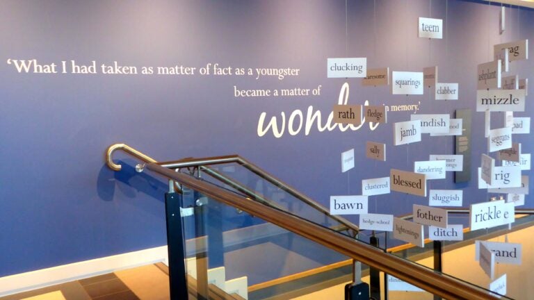 The second floor of HomePlace approaches Heaney more obliquely — not through biography, but through the complementary processes of inspiration and language. A wooden butter paddle provides the tangible root for quoting “Churning Day’’ from Heaney’s first book, “Death of a Naturalist.’’ Boston firefighter Bobby Breen’s fire helmet (a gift to the poet) conjures Heaney’s celebration of the sacrifice of firefighters in his poem “Helmet.’’ Dangling mobiles of words from Heaney’s poems — as quotidian as “clucking,’’ “fledge’’ or “ditch’’ or as evocative as “rath,’’ “mizzle,’’ or “clabber’’ — invite visitors to turn the language around in their mouths for the sheer pleasure of how it feels.