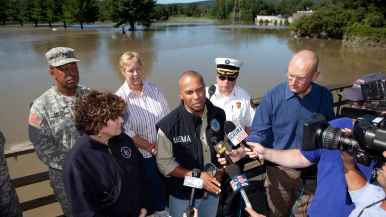 Patrick has also donned a firefighter’s jacket while touring fire scenes in Uxbridge and Northampton. And he wore a fluorescent yellow MEMA jacket when visiting a flood site in Clinton.