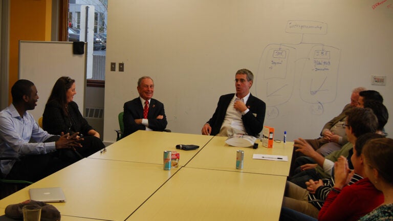 New York City Mayor – and Medford native – Michael Bloomberg talked to students and faculty today at the Martin Trust Center for MIT Entrepreneurship at the Sloan School. Bloomberg spent some of his time on campus talking up Applied Sciences NYC, his initiative to bring an engineering school to NYC to promote job and business creation.