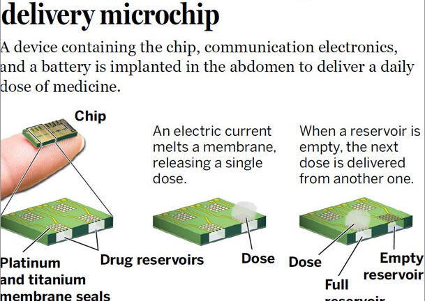 It sounds like science fiction: a doctor implants a device about the size of a domino just under the skin near a patient’s waistline. Over the course of weeks, tiny sealed wells on a chip embedded on the device open one by one, to release a potent drug on a schedule sent to it wirelessly.