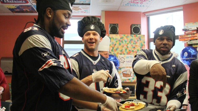 Pats players Julian Edelman, Jerod Mayo, and Kevin Faulk put smiles on the faces of patients at Children’s Hospital Boston today, serving up pancake breakfasts as part of the team’s “Celebrate Volunteerism’’ campaign.