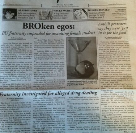 The top story: ‘‘Seven frat dwarves were arrested last night after they allegedly drugged’’ and sexually assaulted a female Boston University student, identified as the ‘‘fairest of them all.’’ It included a picture of a cocktail that Snow White had been drinking, which had been spiked with a date-rape drug.
