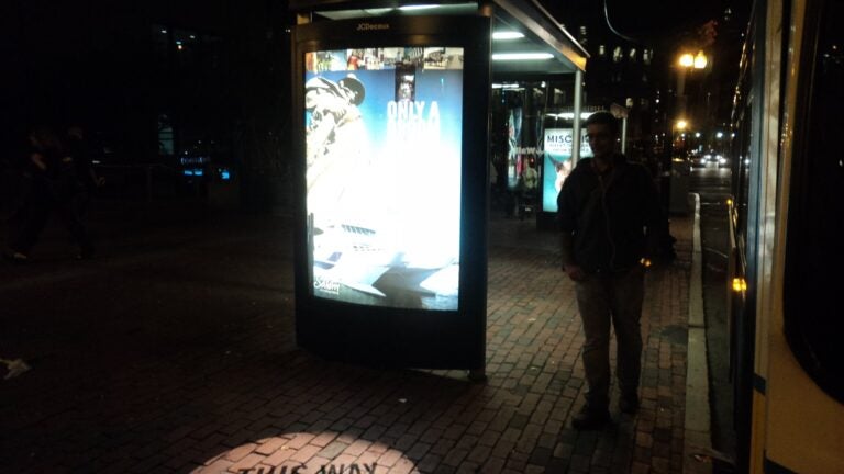 What’s different about this illuminated ad panel is that it can also project a message onto the sidewalk. According to Beverly-based Rattle, this mini street billboard is the only one of its kind in Boston. After dark, the sign will project the message of, “This Way to Salem,’’ onto the sidewalk. The thinking is that this sidewalk message will draw a pedestrian’s eye to the message on the illuminated panel on the bus-stop kiosk. The panel’s message is, “Only a Broom Will Get You To Salem Faster.’’