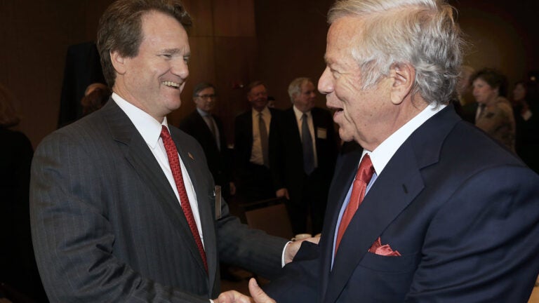 Pats owner Robert Kraft (above right, with Bank of America CEO Brian Moynihan) was the special guest at Friday’s gathering of the Notre Dame Business Council at the Westin Boston Waterfront Hotel. The annual fall luncheon included folks from the Boston College Alumni Association, which made sense considering that ND and BC are playing Saturday.