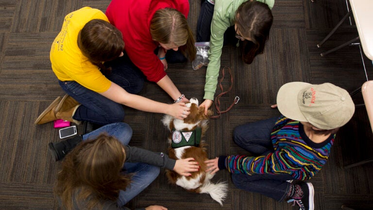BU’s Mugar Memorial Library was barraged this week by a furry, four-legged squad enlisted to help calm students frazzled by finals stress. A mini golden doodle, a King Charles cavalier spaniel, and, of course, a Boston terrier, were among eight dogs from Dog B.O.N.E.S Therapy who helped soothe sleep-deprived students at the end of the semester. “This is the first time [we’ve had the program] at Mugar, and there’s just such demand. [Students] filled all the reservations within 48 hours of putting signs up,’’ said Sara Rimer, a BU spokeswoman. “These are certified therapy dogs; they have excellent, calm personalities. And these kids are stressed out. They’re poking their heads into the room and saying ‘Can I get in?’ ’’ Small groups of students are allotted 15-minute sessions to pet and feed the dogs. Rimer smiled as Annie Oakley, a King Charles cavalier spaniel, bounded up to her. “I feel calmer just being around this dog! She has the most soulful eyes and long beautiful ears. . . . This dog is adorable.’’ Clearly, puppy love was alive and well in Mugar Library. Dog B.O.N.E.S will return to BU Saturday from 5-7 p.m., with a new group of eight dogs available for belly rubs.