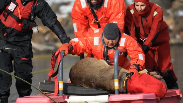 The crew managed to pull the deer to shore by 12:50 p.m. The deer made distressed noises as it was loaded into a box for transportation to the Tufts Wildlife Clinic in Grafton.