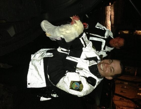 “Officer Difava bravely jumped into action and saved the chicken from certain peril,’’ Somerville police said on the department website. The website featured a photo of a Somerville police officer smiling and holding what appears to be the rescued chicken.