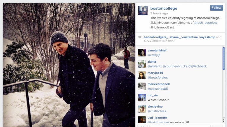 Boston College posted this nice Instagram pic of Liam Neeson touring campus with his son on Tuesday. The photo was taken by Josh Sogolow, BC class of 2017.