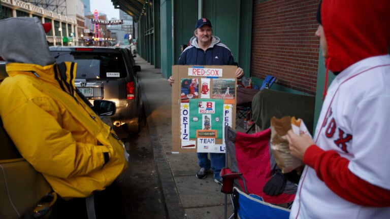 Glenn Reynolds, of Quincy, and others battled the elements outside of Fenway Park at 6:30 a.m. on Monday morning. Dina Rudick / The Boston Globe