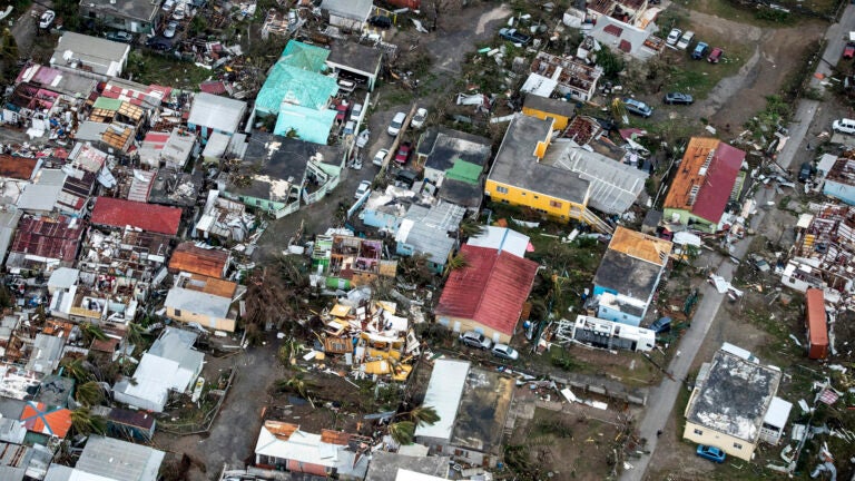 On St. Thomas in the U.S. Virgin Islands, power lines and towers were toppled, a water and sewage treatment plant was heavily damaged, and the harbor was in ruins, along with hundreds of homes and dozens of businesses.