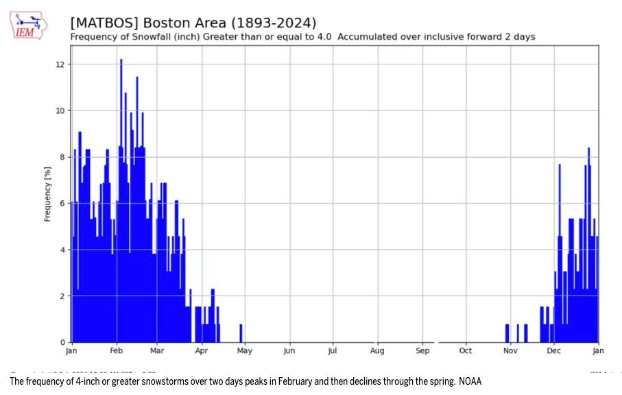 You can see on the graph below how the frequency of larger snowstorms ramps up during February but then quickly tails off. Of course, these are just averages.