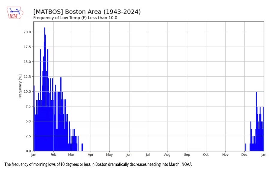 Winter cold typically peaks before mid-February, but the coldest temperatures of the entire winter can occur just about until early March. The chart below gives a clear picture that the chances of subfreezing temperatures below 10 degrees go way down after February.