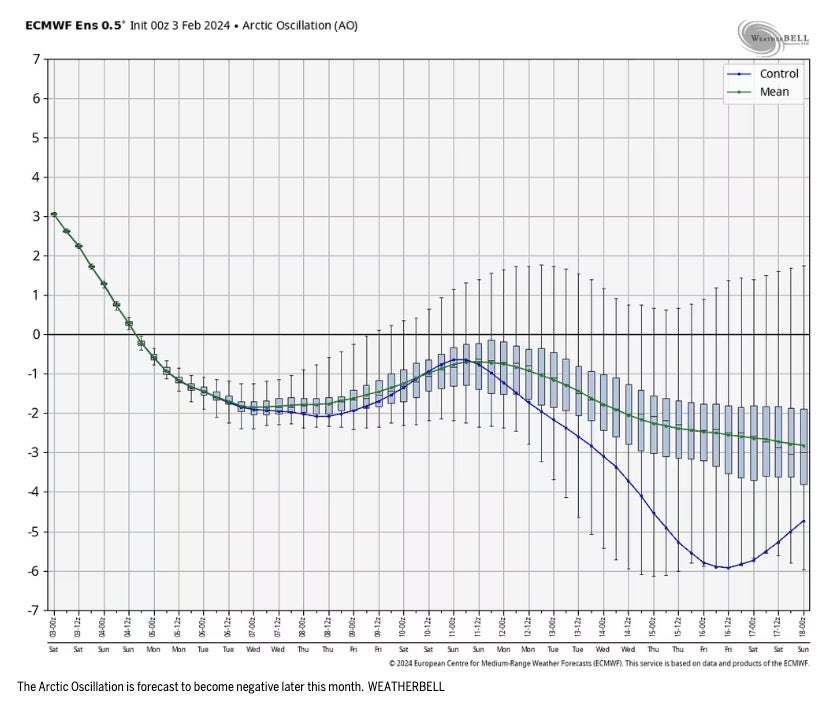 Another player in the rest of winter will be the Arctic Oscillation, the back-and-forth shifting of atmospheric pressure between the Arctic and the mid-latitudes of the North Pacific and North Atlantic.