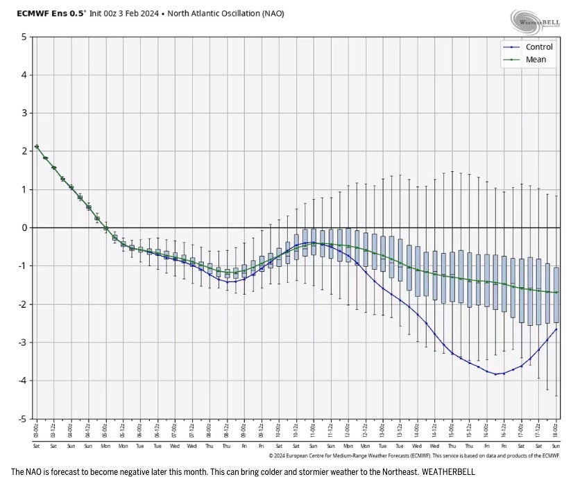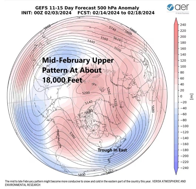 According to Judah Cohen of Verisk Atmospheric and Environmental Research (AER) in Lexington, this type of configuration often, but not always, brings cooler air to New England. This forecast is quite complicated but something certainly to watch for around Valentine’s Day.