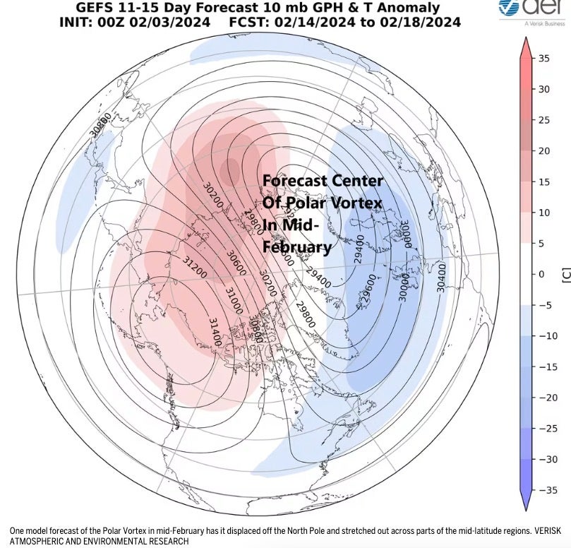 One of the weather models also shows the polar vortex forecast to move from its typical spot over the North Pole to Scandinavia and stretch out from Siberia to New England.