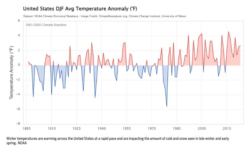 Finally, we can’t ignore the fact that winters are warming in general. Of the four seasons, winter is the fastest warming.